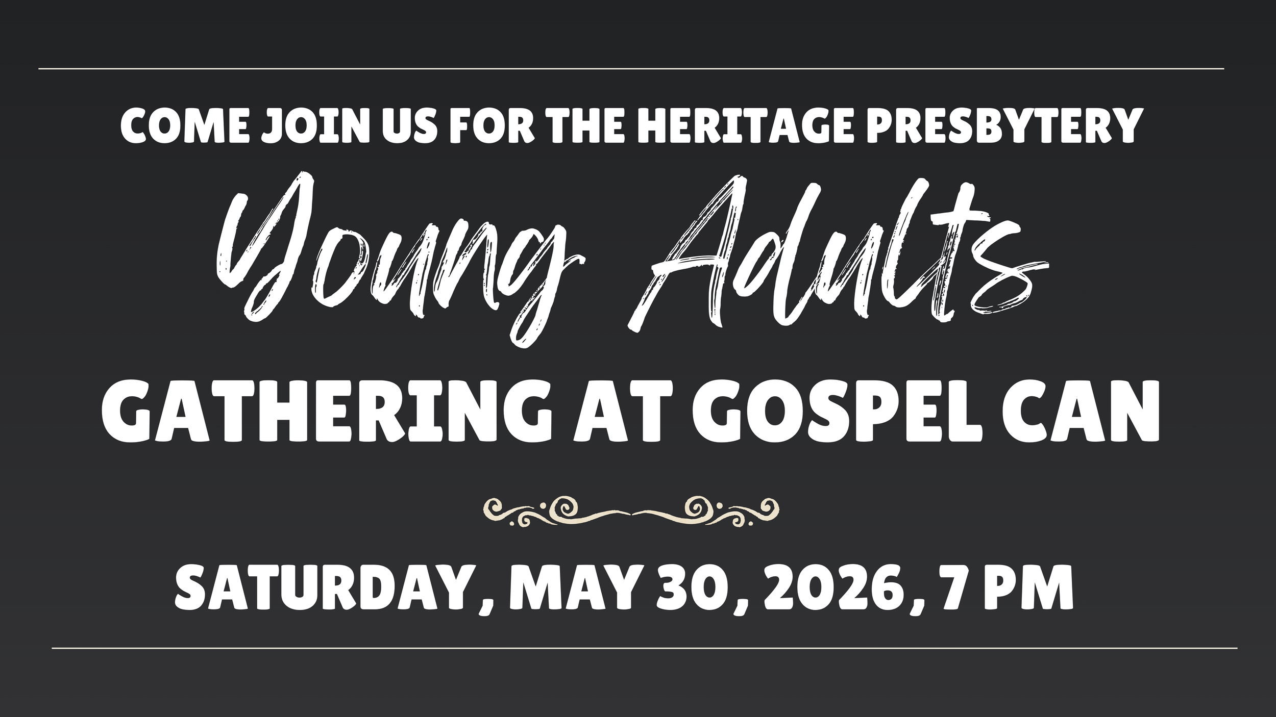 Join us for a Young Adults Fellowship for a meaningful time created to bring together young adults from across our local Heritage Presbytery. We look forward to an evening filled with praise, worship, music, games, and thoughtful discussion, all shared over light refreshments. Interested in joining? Let us know at office@GospelCAN.org.